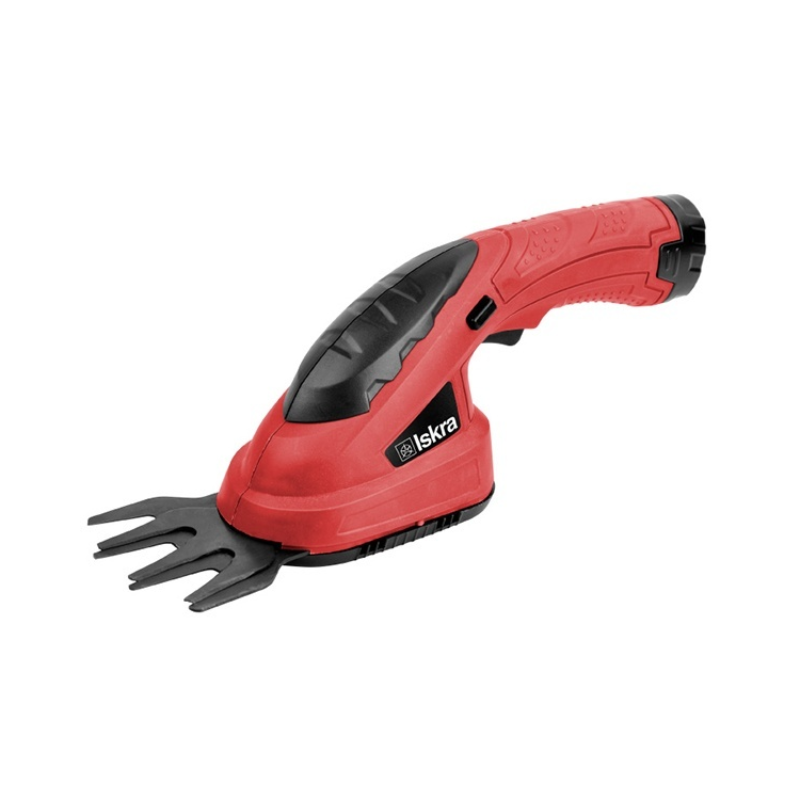 Akumulatorske škare za travu i grmlje Iskra N0E-11ET-3.6-B s naponom od 3,6 V, te 1,5 Ah Li-ion baterijom. Škare imaju širinu reza 80 mm (trava) i dužinu 110 mm (grmlje). Škare Iskra imaju samo0,298 kg. U paketu su nastavak za rezanje trave, nastavak za rezanje grmlja te bateriju i punjač..